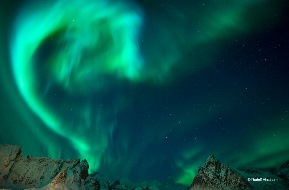 Rudolf Abraham photographed the Northern Lights above the mountains surrounding Reinefjord on Norway’s Lofoten Islands. His photos have been published in Outdoor Enthusiast and France Magazine.